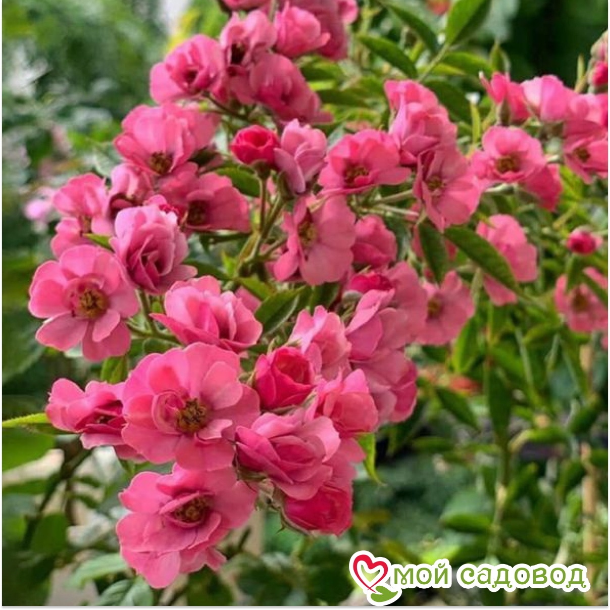 Цветки малиновые с белой серединкой и желтыми тычинками, полумахровые, мелкие, собраны в большие кисти по 20-50 шт., похож на гортензию. Цветёт роза однократно в течении месяца. Куст раскидистый очень мощный , ветви до 1.5 метров, без шипов. Зимостойкий, не болеет. Уход за розами заключается в систематическом рыхлении грунта, удалении сорняков, профилактике заболеваний, подкормке и обрезке. Подкормку роз проводят сезонно: азотом – весной, фосфором и калием – летом. Несмотря на засухоустойчивость, полив роз – процедура обязательная, особенно в жаркие и засушливые периоды. Поливают растения не холодной водой из расчета на куст 15-20 л воды, в сухую и теплую погоду – два раза в неделю. К концу лета полив сокращается и прекращается вовсе с наступлением сентября. В первый год допускать раннего цветения молодых растений не следует. Вплоть до начала августа бутоны роз с кустов удаляют. В августе оставляют по 1-2 цветка на каждом побеге и не срезают их, чтобы осенью завязались плоды. Побеги розы в таком случае лучше вызревают, хорошо перезимовывают и на будущий год обильно цветут. В нашем интернет-магазине вы сможете купить Чайно-гибридные розы Так же возможно вас заинтересуют Роза Бургунд-81 и Роза Версилия.