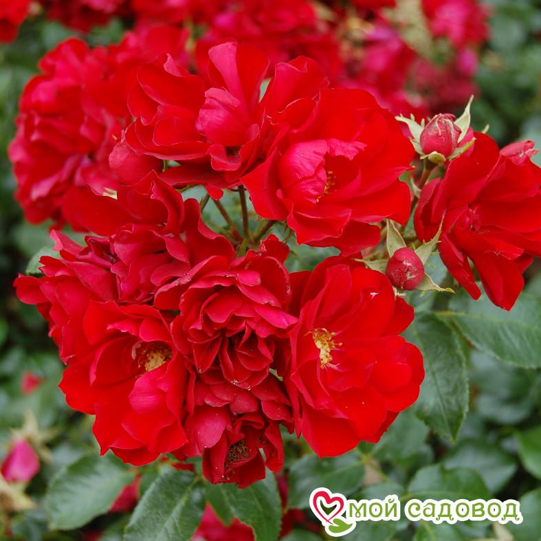 Центро-Розе – это компактный, но густой куст. Взрослые саженцы достигают 50 см в высоту. В течение всего сезона они обильно покрыты махровыми цветками, состоящими из 20 – 22 лепестков. Раскрывшиеся бутоны насыщенного красного цвета, диаметром около 6 см. Собраны они в кистевидные соцветия. Также сорт смотрится декоративно благодаря красивой листве. Она всегда свежая, зелёная, с глянцевой поверхностью. Роза источает нежный, приятный аромат.